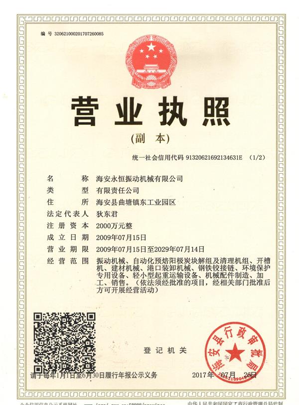 當前所在的位置:海安永恒振動機械有限公司 >> 資質證書 >> 營業執照